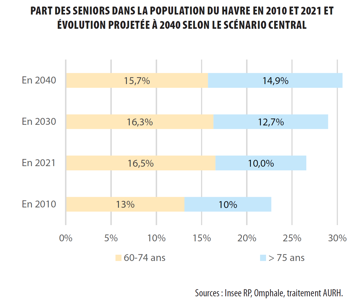 En 2021, 44 107 habitants du Havre sont âgés de plus de 60 ans, soit 26,5 % de la population communale.