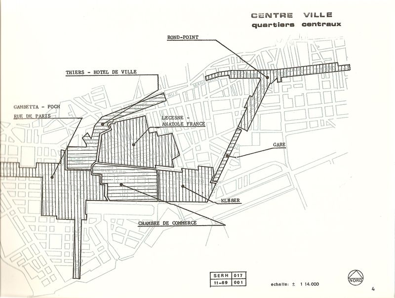 L’étape 1, de 1970 à 1980, vise à densifier les activités du centre actuel (Hôtel de Ville, place Thiers) et l’agrandir vers l’est, secteur jules Lecesne - Anatole France.